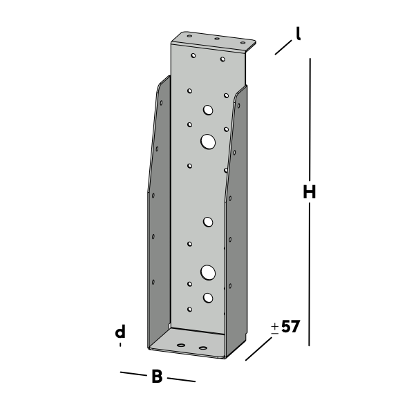 Balkdrager met korte lip, voor het verbinden van dwarsbalken aan een houten kantplank die aan de muur is gemonteerd. De balkdrager rust met de lip op de kantplank en wordt via de gaten in de rug bevestigd. Hierna wordt een dwarsbalk ingelegd die via de gaten in de zijkant van de balkdrager kan worden gefixeerd.