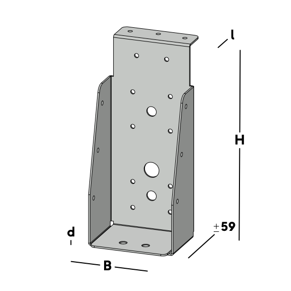 Balkdrager met korte lip, voor het verbinden van dwarsbalken aan een houten kantplank die aan de muur is gemonteerd. De balkdrager rust met de lip op de kantplank en wordt via de gaten in de rug bevestigd. Hierna wordt een dwarsbalk ingelegd die via de gaten in de zijkant van de balkdrager kan worden gefixeerd.