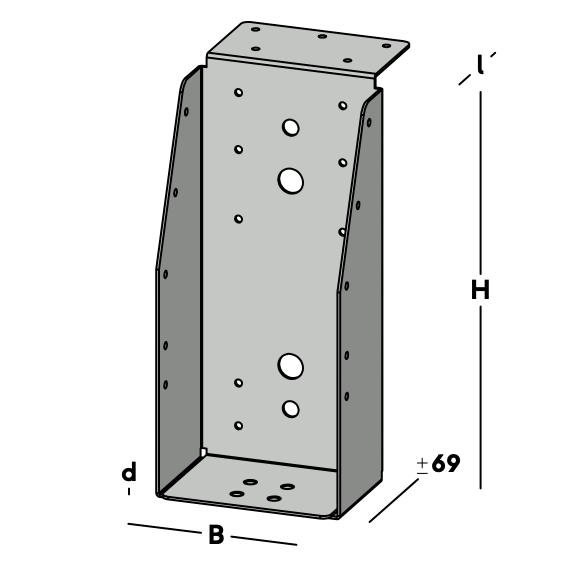 Balkdrager met lange lip, voor het verbinden van dwarsbalken aan een hoofdbalk (moerbalk). De balkdrager rust met de lip op de hoofdbalk en wordt via de gaten in de rug bevestigd. Hierna wordt een dwarsbalk ingelegd die via de gaten in de zijkant van de balkdrager kan worden gefixeerd.