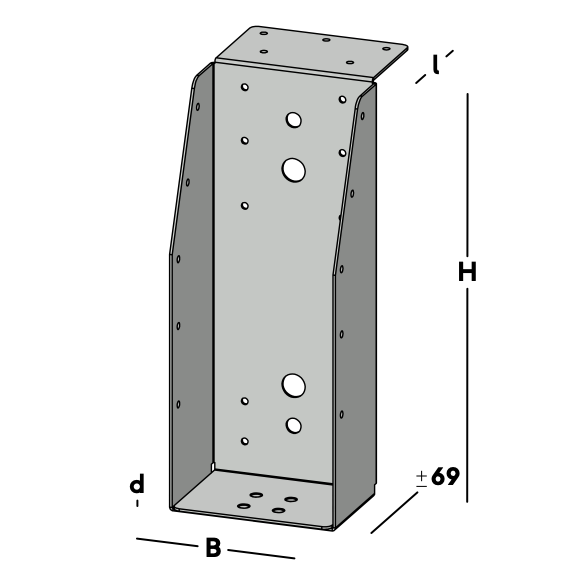 Balkdrager met lange lip, voor het verbinden van dwarsbalken aan een hoofdbalk (moerbalk). De balkdrager rust met de lip op de hoofdbalk en wordt via de gaten in de rug bevestigd. Hierna wordt een dwarsbalk ingelegd die via de gaten in de zijkant van de balkdrager kan worden gefixeerd.
