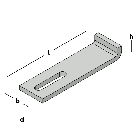 A heavy mounting strip with a short bent end is known as an element anchor (or J-Anchor). Suitable for mounting HSB cavity walls on a concrete floor with a rebate in the element's bottom lintel. Element rubbers are placed on the curved end to match the rebate width of the frame.