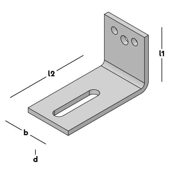 Heavy angle anchor with a hole pattern corresponding to the required and common fasteners. The slotted hole allows for simple adjustment. These corner anchors are made of thick steel and can withstand a high load.