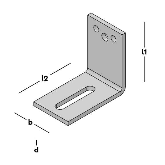 Heavy angle anchor with a hole pattern corresponding to the required and common fasteners. The slotted hole allows for simple adjustment. These corner anchors are made of thick steel and can withstand a high load.