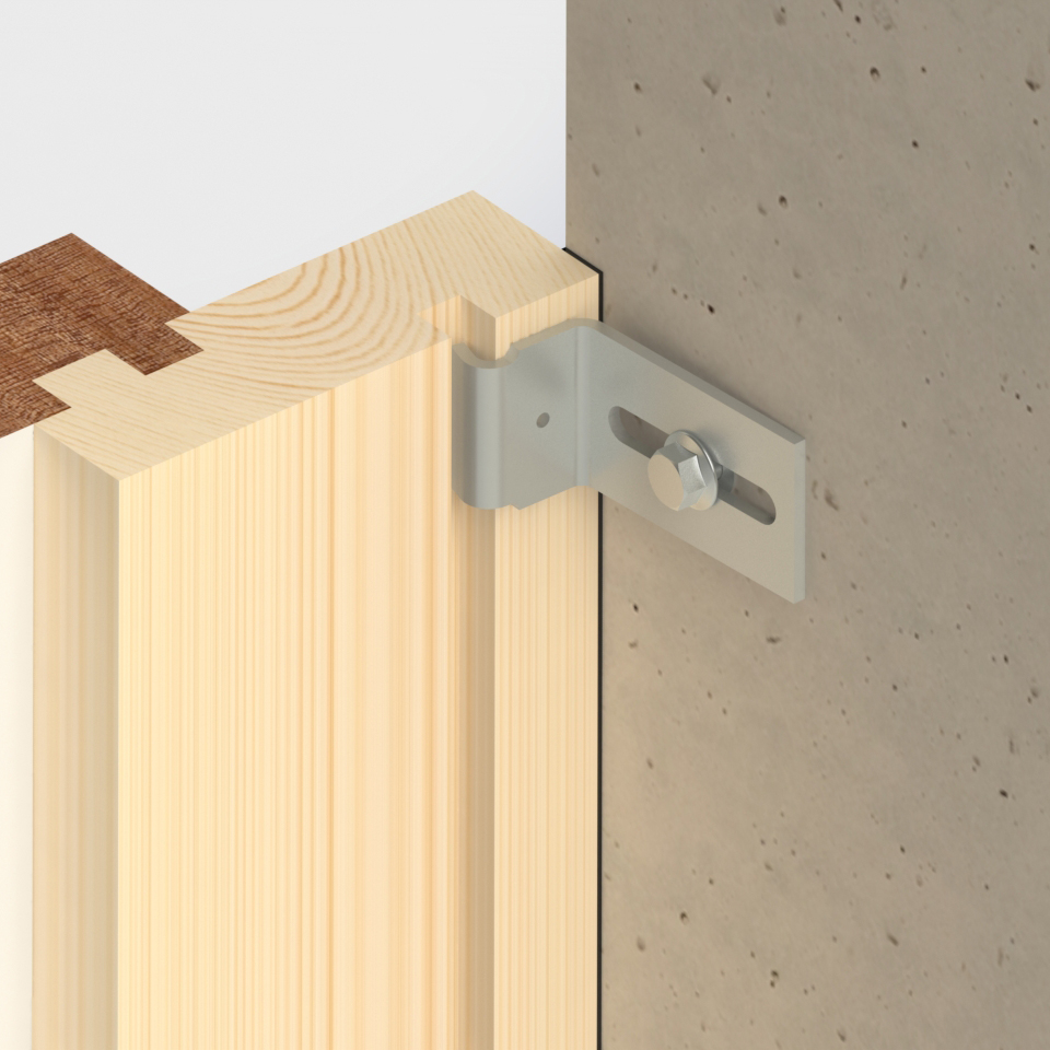 Set strip with a special (hook) setting for 'clamping' a window frame with rebate in a (prefab) concrete inner cavity wall. Locking plates have one or more slotted holes to allow the frame to be properly adjusted.