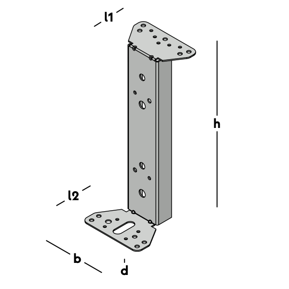 U-profile with mounting plates on both ends. Suitable for directly supporting heavy façade-filling elements or PU structures on the foundation beam. In this model, one mounting plate is arched outwards, for situations where space is limited.