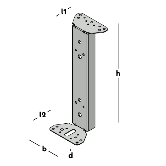 U-profile with mounting plates on both ends. Suitable for directly supporting heavy façade-filling elements or PU structures on the foundation beam. In this model, one mounting plate is arched outwards, for situations where space is limited.