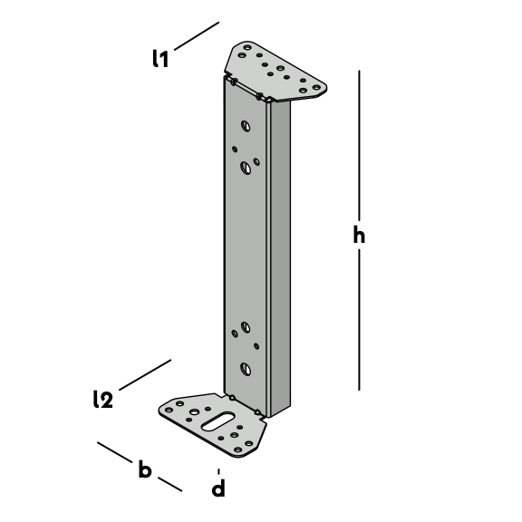 U-profile with mounting plates on both ends. Suitable for directly supporting heavy façade-filling elements or PU structures on the foundation beam. In this model, one mounting plate is arched outwards, for situations where space is limited.