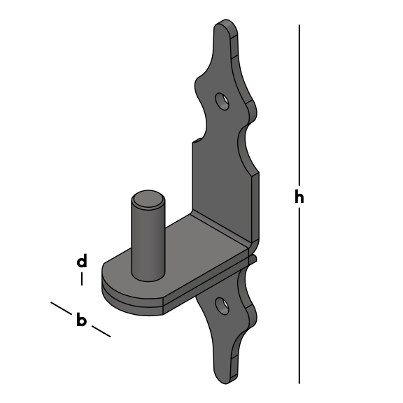 Pin Ø 16mm fitted with a Rustic-shaped backplate with screw holes. With extra distance between the pin and the plate for use in a situation with a recessed negge. For use in combination with a thumb handle.