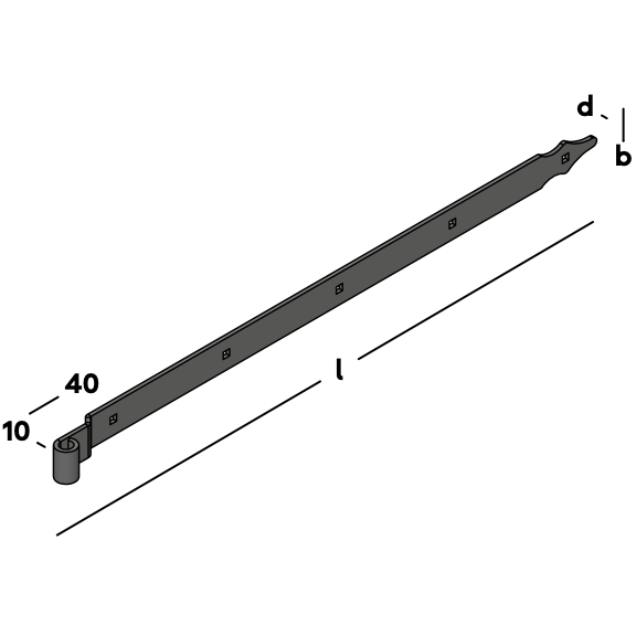 Rustic-shaped handle for hinged fixing of gates and doors. Fitted with square (carriage bolt) holes and an offset for flatwork. The offset of the hinge is equal to the (overlapping) thickness of the thumb so that the door is flush with the frame.