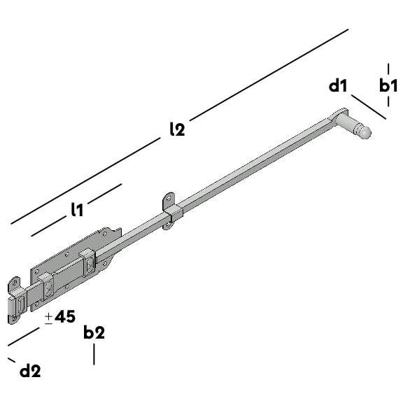 Surface-mounted lock for e.g. gates and doors. Fitted with extended handle. Fitted with mounting plate with fixing holes. Locking bracket included.