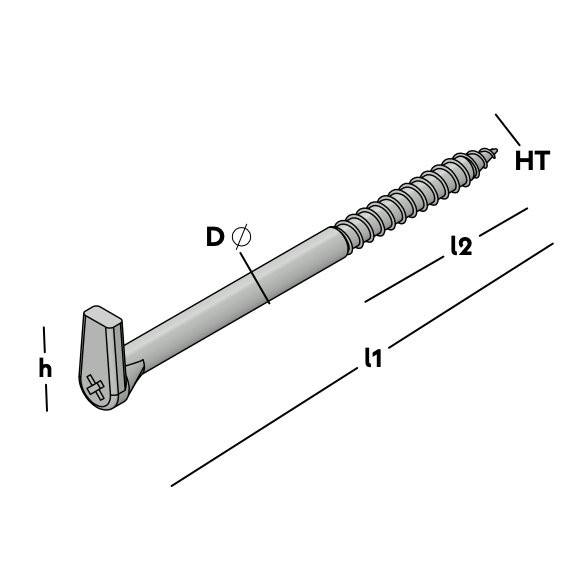 Self-tapping square hook with Philips head for screwdrivers, ideal for wall attachment points. Available in various sizes.
