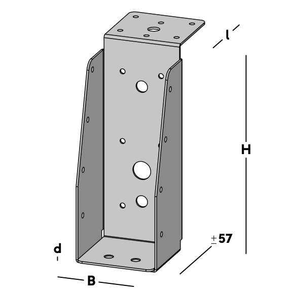 Beam carrier with long lip, for connecting joists to a main beam (nut beam). The beam carrier rests with the lip on the main beam and is fixed via the holes in the back. A crossbeam is then inserted and screwed in via the holes in the side.