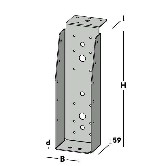 Beam carrier with long lip, for connecting joists to a main beam (nut beam). The beam carrier rests with the lip on the main beam and is fixed via the holes in the back. A crossbeam is then inserted and screwed in via the holes in the side.