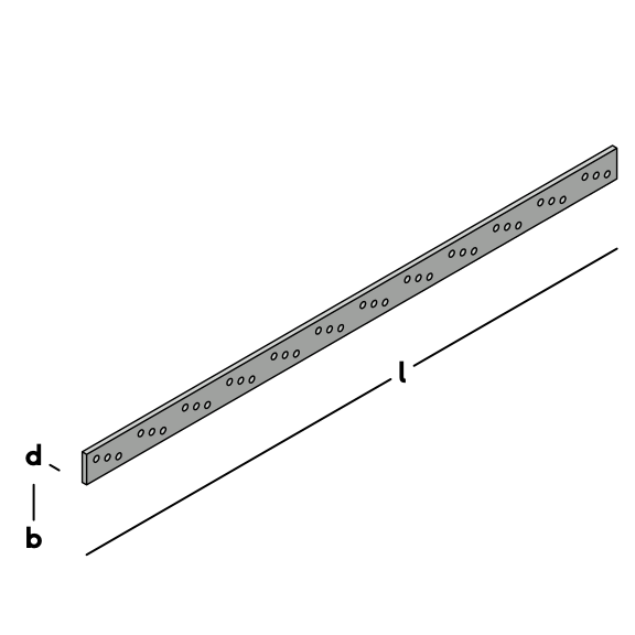 Heavy mounting strip with repetitive hole pattern to connect wooden parts.