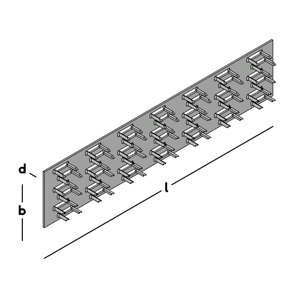 The rectangular coupling plate has one converted side and a regular pattern of reinforcing grooves and nail holes. Suitable for nailing thicker or wider wood parts together flush.