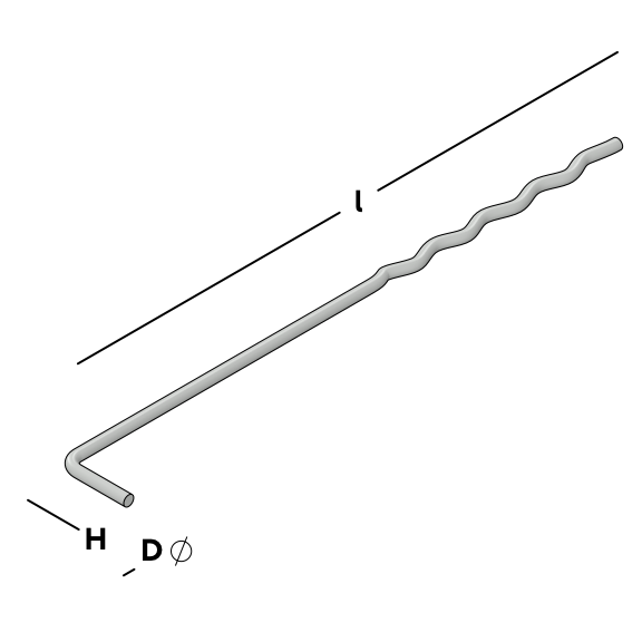 Ancrage traditionnel à cavité en fil en forme de L pour le mur intérieur en béton et en profil ondulé pour le mur extérieur en béton.
