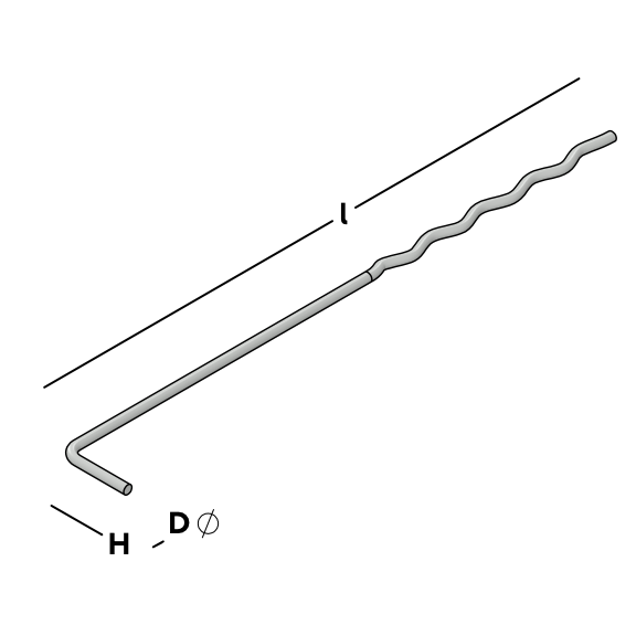 Ancrage traditionnel à cavité en fil en forme de L pour le mur intérieur en béton et en profil ondulé pour le mur extérieur en béton.