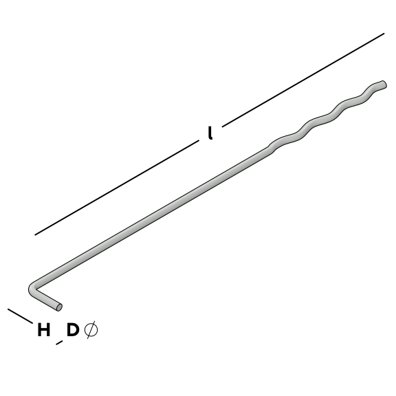 Ancrage traditionnel à cavité en fil en forme de L pour le mur intérieur en béton et en profil ondulé pour le mur extérieur en béton.