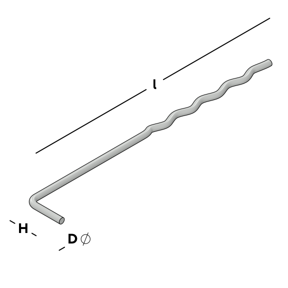 Ancrage traditionnel à cavité en fil en forme de L pour le mur intérieur en béton et en profil ondulé pour le mur extérieur en béton.
