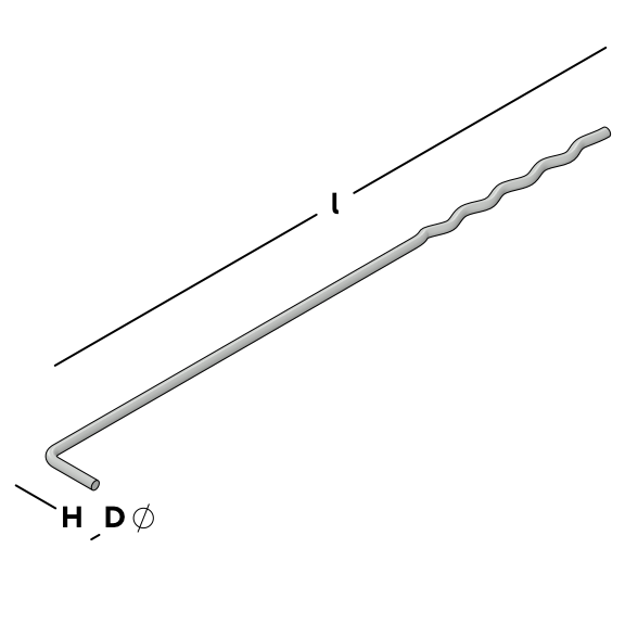 Ancrage traditionnel à cavité en fil en forme de L pour le mur intérieur en béton et en profil ondulé pour le mur extérieur en béton.