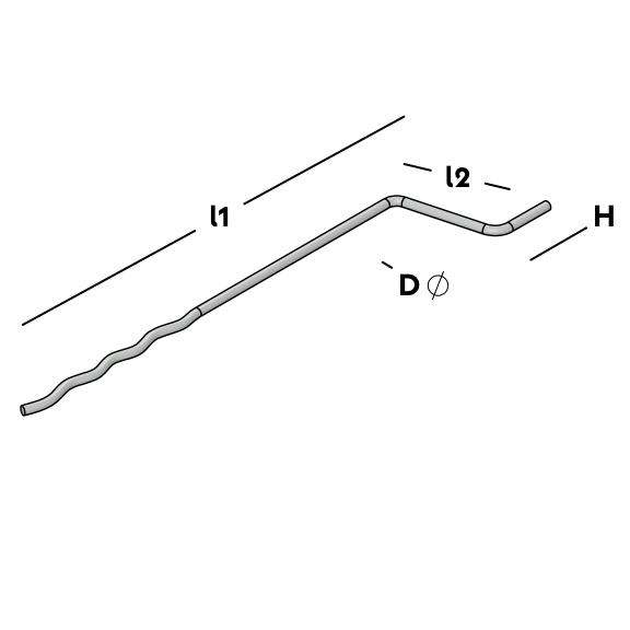 Ancrage à cavité qui est inséré dans le béton humide lors du coulage des murs intérieurs en béton préfabriqué. Sur le chantier, les ancrages à cavité sont placés bien droits et l'isolation peut être fixée par-dessus. L'extrémité ondulée est ensuite insérée dans le béton.