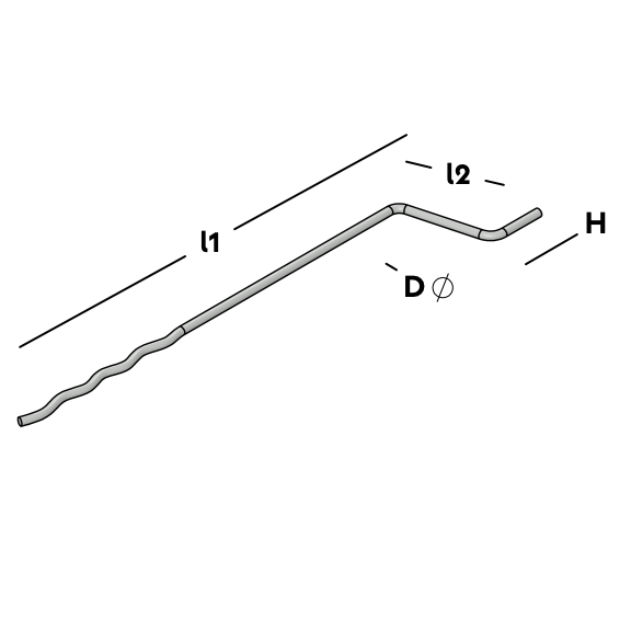 Ancrage à cavité qui est inséré dans le béton humide lors du coulage des murs intérieurs en béton préfabriqué. Sur le chantier, les ancrages à cavité sont placés bien droits et l'isolation peut être fixée par-dessus. L'extrémité ondulée est ensuite insérée dans le béton.