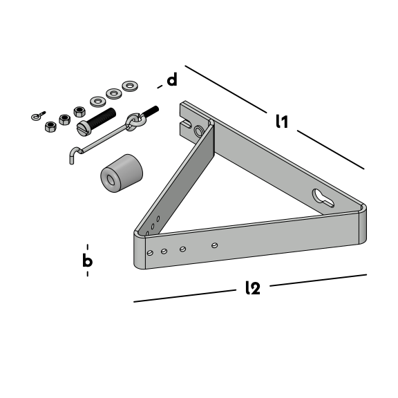 Support d'arrêt de porte, modèle triangulaire. Convient pour un montage sur le mur extérieur afin de bloquer une porte qui s'ouvre vers l'extérieur. Comprend un amortisseur de porte et un crochet de sécurité.