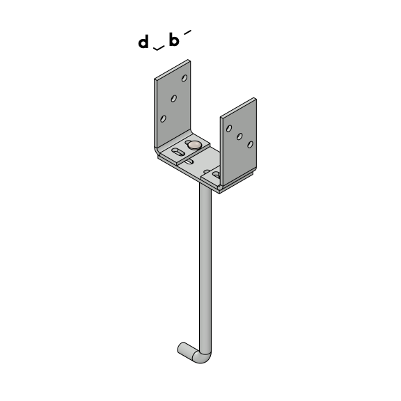 Support de poteau réglable en largeur pour colonnes en bois. Équipé d'une cheville d'ancrage qui peut être enfoncée dans un sol en béton.