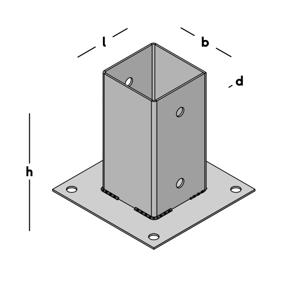 Sabot de colonne pour poteaux de jardin. Équipé d'une plaque de montage pour la fixation sur une base en béton.