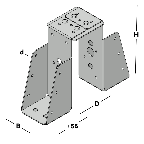 Dubbele balkdrager die over een hoofdbalk (moerbalk) wordt gehangen en vervolgens aan weerszijden in de rug van elke balkdrager wordt bevestigd. Vervolgens wordt aan elke kant een dwarsbalk ingelegd die via de gaten in de zijkant van de balkdragers kunnen worden gefixeerd. Dit product wordt geleverd op bestelspecificatie, afhankelijk van de dikte van de hoofdbalk (afstand tussen de balkschoenen).