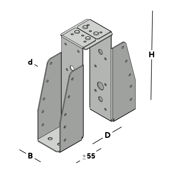 Dubbele balkdrager die over een hoofdbalk (moerbalk) wordt gehangen en vervolgens aan weerszijden in de rug van elke balkdrager wordt bevestigd. Vervolgens wordt aan elke kant een dwarsbalk ingelegd die via de gaten in de zijkant van de balkdragers kunnen worden gefixeerd. Dit product wordt geleverd op bestelspecificatie, afhankelijk van de dikte van de hoofdbalk (afstand tussen de balkschoenen).