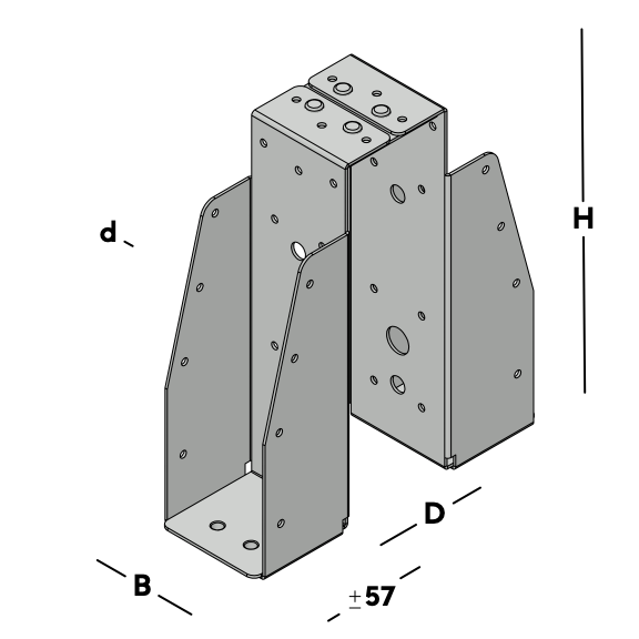 Dubbele balkdrager die over een hoofdbalk (moerbalk) wordt gehangen en vervolgens aan weerszijden in de rug van elke balkdrager wordt bevestigd. Vervolgens wordt aan elke kant een dwarsbalk ingelegd die via de gaten in de zijkant van de balkdragers kunnen worden gefixeerd. Dit product wordt geleverd op bestelspecificatie, afhankelijk van de dikte van de hoofdbalk (afstand tussen de balkschoenen).