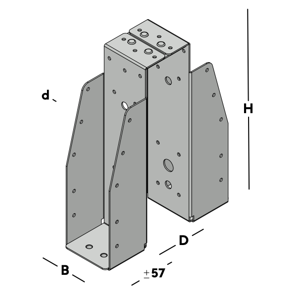 Dubbele balkdrager die over een hoofdbalk (moerbalk) wordt gehangen en vervolgens aan weerszijden in de rug van elke balkdrager wordt bevestigd. Vervolgens wordt aan elke kant een dwarsbalk ingelegd die via de gaten in de zijkant van de balkdragers kunnen worden gefixeerd. Dit product wordt geleverd op bestelspecificatie, afhankelijk van de dikte van de hoofdbalk (afstand tussen de balkschoenen).