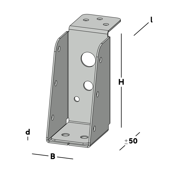 Balkdrager met korte lip, voor het verbinden van dwarsbalken aan een houten kantplank die aan de muur is gemonteerd. De balkdrager rust met de lip op de kantplank en wordt via de gaten in de rug bevestigd. Hierna wordt een dwarsbalk ingelegd die via de gaten in de zijkant van de balkdrager kan worden gefixeerd.