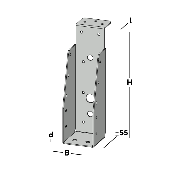 Balkdrager met korte lip, voor het verbinden van dwarsbalken aan een houten kantplank die aan de muur is gemonteerd. De balkdrager rust met de lip op de kantplank en wordt via de gaten in de rug bevestigd. Hierna wordt een dwarsbalk ingelegd die via de gaten in de zijkant van de balkdrager kan worden gefixeerd.