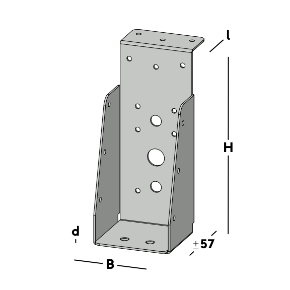 Balkdrager met korte lip, voor het verbinden van dwarsbalken aan een houten kantplank die aan de muur is gemonteerd. De balkdrager rust met de lip op de kantplank en wordt via de gaten in de rug bevestigd. Hierna wordt een dwarsbalk ingelegd die via de gaten in de zijkant van de balkdrager kan worden gefixeerd.