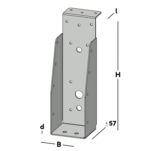 Balkdrager met korte lip, voor het verbinden van dwarsbalken aan een houten kantplank die aan de muur is gemonteerd. De balkdrager rust met de lip op de kantplank en wordt via de gaten in de rug bevestigd. Hierna wordt een dwarsbalk ingelegd die via de gaten in de zijkant van de balkdrager kan worden gefixeerd.