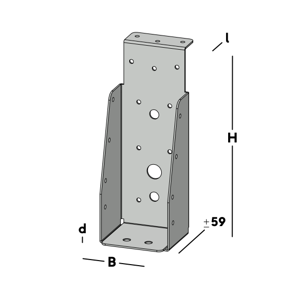 Balkdrager met korte lip, voor het verbinden van dwarsbalken aan een houten kantplank die aan de muur is gemonteerd. De balkdrager rust met de lip op de kantplank en wordt via de gaten in de rug bevestigd. Hierna wordt een dwarsbalk ingelegd die via de gaten in de zijkant van de balkdrager kan worden gefixeerd.