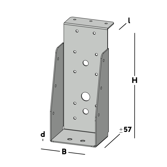 Balkdrager met korte lip, voor het verbinden van dwarsbalken aan een houten kantplank die aan de muur is gemonteerd. De balkdrager rust met de lip op de kantplank en wordt via de gaten in de rug bevestigd. Hierna wordt een dwarsbalk ingelegd die via de gaten in de zijkant van de balkdrager kan worden gefixeerd.