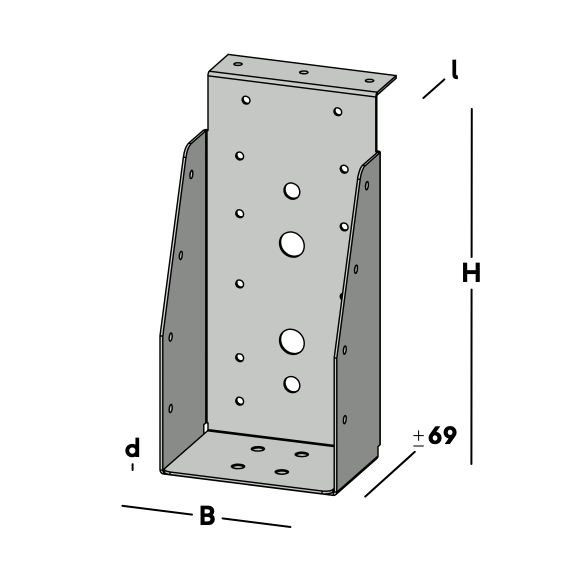 Balkdrager met korte lip, voor het verbinden van dwarsbalken aan een houten kantplank die aan de muur is gemonteerd. De balkdrager rust met de lip op de kantplank en wordt via de gaten in de rug bevestigd. Hierna wordt een dwarsbalk ingelegd die via de gaten in de zijkant van de balkdrager kan worden gefixeerd.