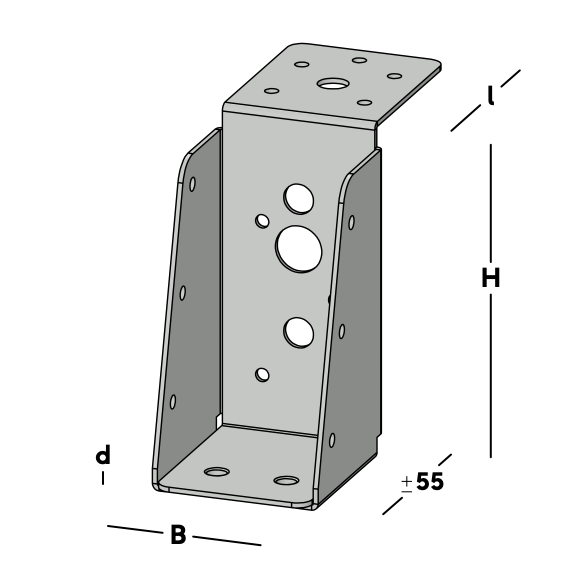 Balkdrager met lange lip, voor het verbinden van dwarsbalken aan een hoofdbalk (moerbalk). De balkdrager rust met de lip op de hoofdbalk en wordt via de gaten in de rug bevestigd. Hierna wordt een dwarsbalk ingelegd die via de gaten in de zijkant van de balkdrager kan worden gefixeerd.