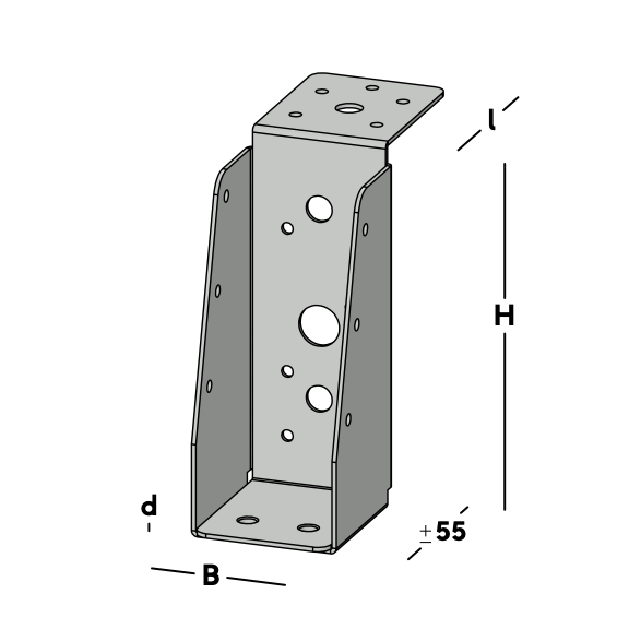 Balkdrager met lange lip, voor het verbinden van dwarsbalken aan een hoofdbalk (moerbalk). De balkdrager rust met de lip op de hoofdbalk en wordt via de gaten in de rug bevestigd. Hierna wordt een dwarsbalk ingelegd die via de gaten in de zijkant van de balkdrager kan worden gefixeerd.