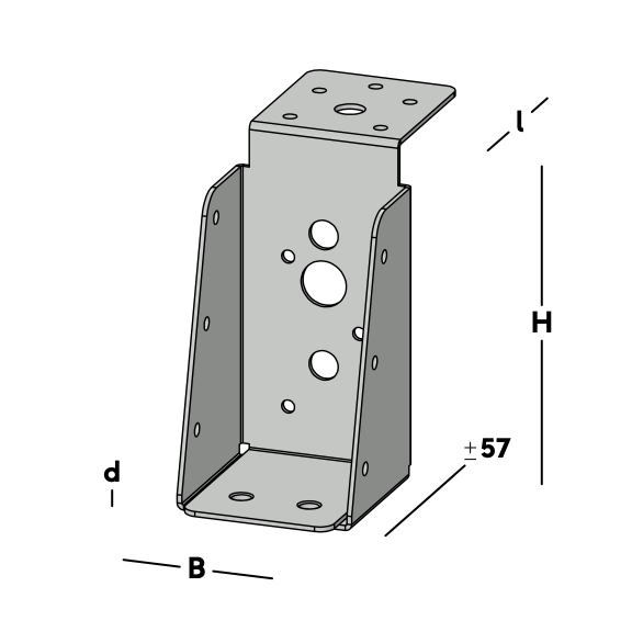 Balkdrager met lange lip, voor het verbinden van dwarsbalken aan een hoofdbalk (moerbalk). De balkdrager rust met de lip op de hoofdbalk en wordt via de gaten in de rug bevestigd. Hierna wordt een dwarsbalk ingelegd die via de gaten in de zijkant van de balkdrager kan worden gefixeerd.