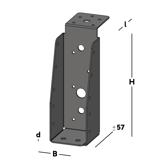 Balkdrager met lange lip, voor het verbinden van dwarsbalken aan een hoofdbalk (moerbalk). De balkdrager rust met de lip op de hoofdbalk en wordt via de gaten in de rug bevestigd. Hierna wordt een dwarsbalk ingelegd die via de gaten in de zijkant van de balkdrager kan worden gefixeerd.