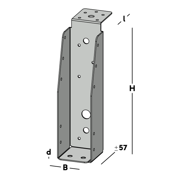 Balkdrager met lange lip, voor het verbinden van dwarsbalken aan een hoofdbalk (moerbalk). De balkdrager rust met de lip op de hoofdbalk en wordt via de gaten in de rug bevestigd. Hierna wordt een dwarsbalk ingelegd die via de gaten in de zijkant van de balkdrager kan worden gefixeerd.