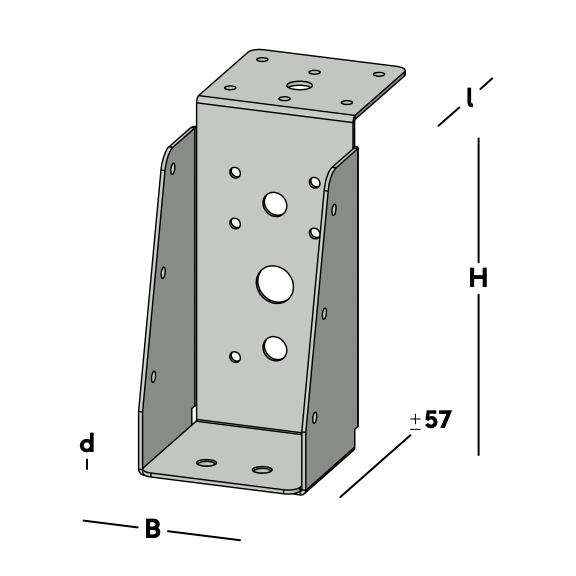 Balkdrager met lange lip, voor het verbinden van dwarsbalken aan een hoofdbalk (moerbalk). De balkdrager rust met de lip op de hoofdbalk en wordt via de gaten in de rug bevestigd. Hierna wordt een dwarsbalk ingelegd die via de gaten in de zijkant van de balkdrager kan worden gefixeerd.