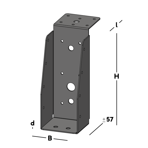 Balkdrager met lange lip, voor het verbinden van dwarsbalken aan een hoofdbalk (moerbalk). De balkdrager rust met de lip op de hoofdbalk en wordt via de gaten in de rug bevestigd. Hierna wordt een dwarsbalk ingelegd die via de gaten in de zijkant van de balkdrager kan worden gefixeerd.