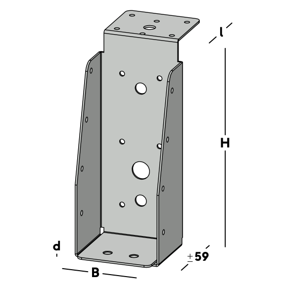 Balkdrager met lange lip, voor het verbinden van dwarsbalken aan een hoofdbalk (moerbalk). De balkdrager rust met de lip op de hoofdbalk en wordt via de gaten in de rug bevestigd. Hierna wordt een dwarsbalk ingelegd die via de gaten in de zijkant van de balkdrager kan worden gefixeerd.