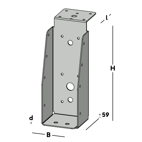 Balkdrager met lange lip, voor het verbinden van dwarsbalken aan een hoofdbalk (moerbalk). De balkdrager rust met de lip op de hoofdbalk en wordt via de gaten in de rug bevestigd. Hierna wordt een dwarsbalk ingelegd die via de gaten in de zijkant van de balkdrager kan worden gefixeerd.