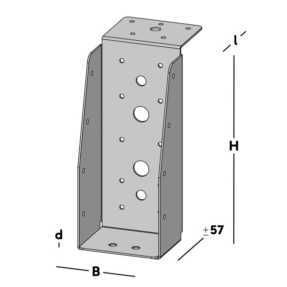 Balkdrager met lange lip, voor het verbinden van dwarsbalken aan een hoofdbalk (moerbalk). De balkdrager rust met de lip op de hoofdbalk en wordt via de gaten in de rug bevestigd. Hierna wordt een dwarsbalk ingelegd die via de gaten in de zijkant van de balkdrager kan worden gefixeerd.